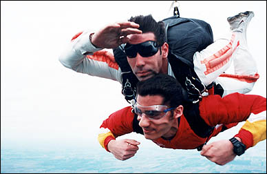 Ali Hammoud, on the bottom, celebrates his graduating with a B.Comm in this free fall at 7,500 feet. Accompanied by instructor Carl Ledoux, Hammoud fell for 10 seconds before his parachute opened. The rest was a lulling four-minute sail to the fields near Farnham, Quebec, home to Nouvel Air, the company where the McGill Flying Club runs its flying and sky-jumping programs.